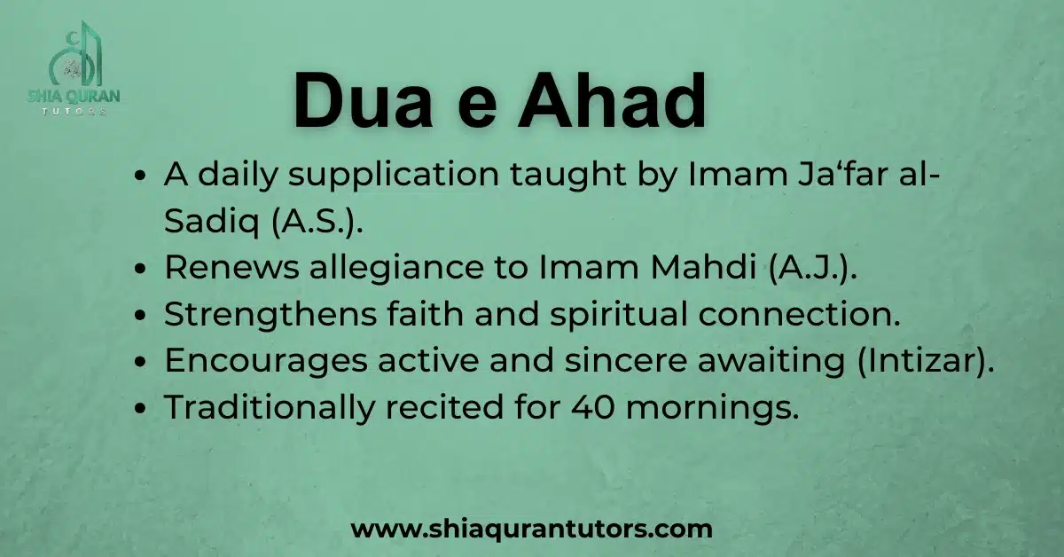 The supplication of allegiance is a supplication narrated from the Ahlul Bayt (عليهم السلام) and is traditionally recited every morning. The word “Ahad” means promise or covenant. Through this dua, a believer renews their pledge to stand by Imam Mahdi (عج) with sincerity, obedience, and preparedness.