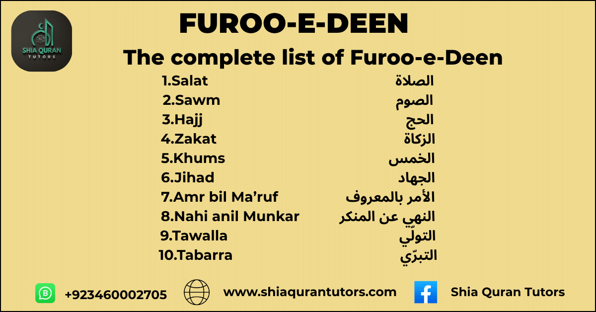 It means “branches of religion” — the practical aspects of Islam that guide a Muslim’s daily actions. - How many Furoo e Deen are there in Shia Islam?
